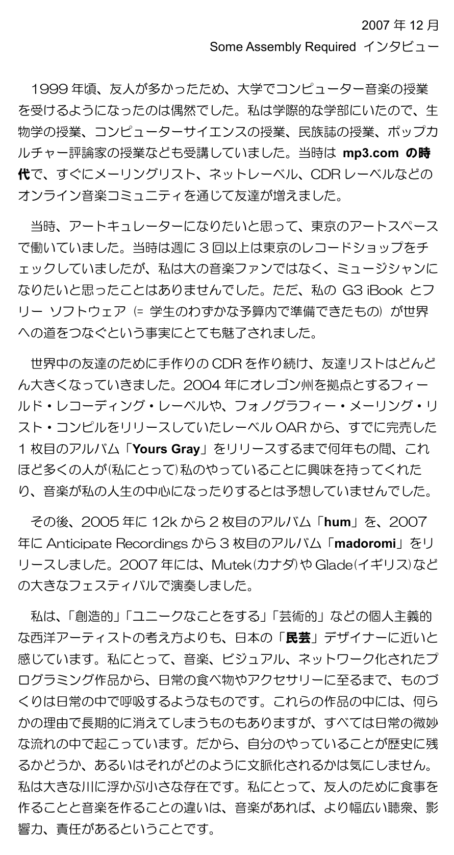 2ndアルバム。 日常生活の音(フィールドレコーディング)と電子音を独自に組み合わせ、女性的なタッチを加えたエレガントで緻密な作品。少女らしい無邪気さと好奇心も同時に感じられる。 前作 Yours grey が無機質で実験的であったのに比べて、有機的・音楽的な作品に。